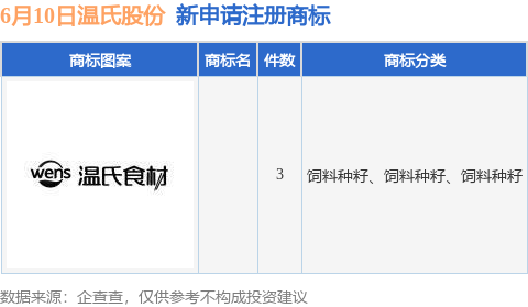 证券之星消息,根据天眼查APP数据显示,近日温氏食品集团股份有限公司新提交3件商标注册申请。商标申请详情如下: